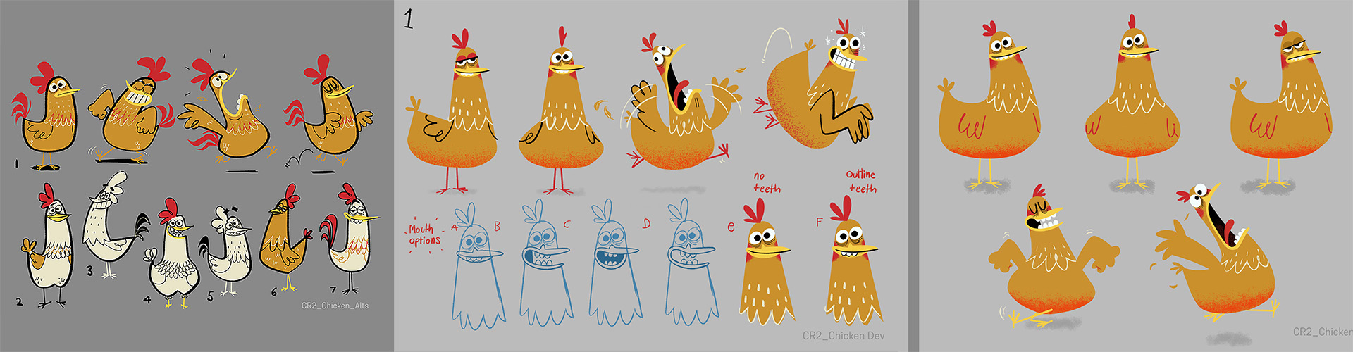 After being given the storyboards by Aardman, the first thing to do was create an initial rough design to test the waters. In a film all about chickens, funnily enough the most important thing was… getting the chicken design right. The jagged 1950s- 60s design style isn’t a natural fit for Chicken Run’s more rounded characters so striking a nice balance between the two took some development. But after a bit of back and forth we found a perfect retro cocktail that we could roll out throughout the animation and the end credits.